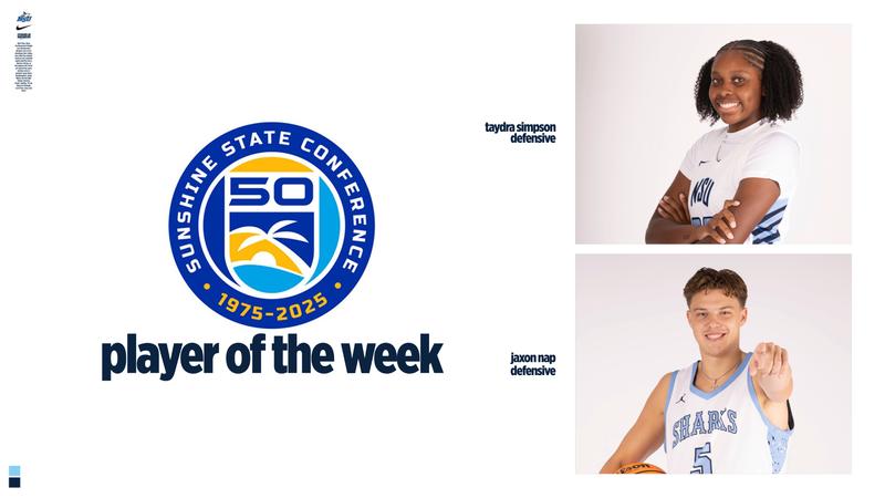 ORLANDO, Fla. – The Sunshine State Conference announced its weekly award winners for the week of February 9-15, and two Sharks were highlighted. Taydra Simpson and Jaxon Nap were named Women’s Basketball Defensive Player of the Week and Men’s Basketball Defensive Player of the Week, respectively.